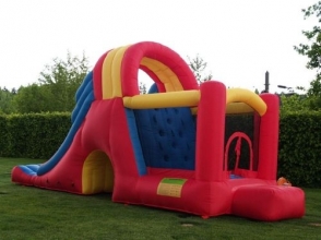 - Nafukovací velká párty skluzavka disponuje dvěmi skluzavkami, takže děti mohou závodit kdo dříve dojede do cíle. V zadní části atrakce je skákací prostor a pod dvěmi skluzavkami je prolízačka. Než se děti svezou musejí překoant překážku v podobě lezecké stěny, potom za svůj výkon jsou odměněni možností svezení na skluzavce.